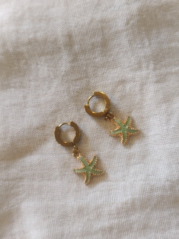 Aros cierre con traba en acero dorado combinado con dije estrella de mar en metal esmaltado
