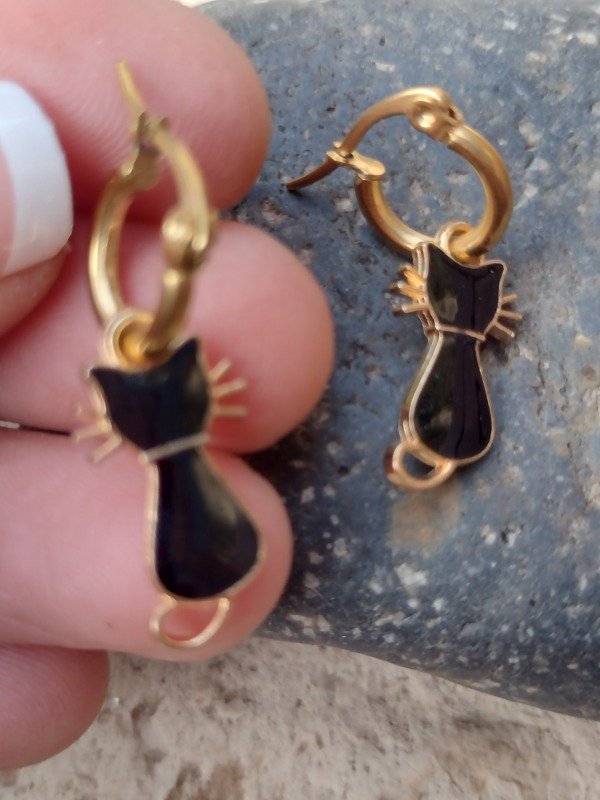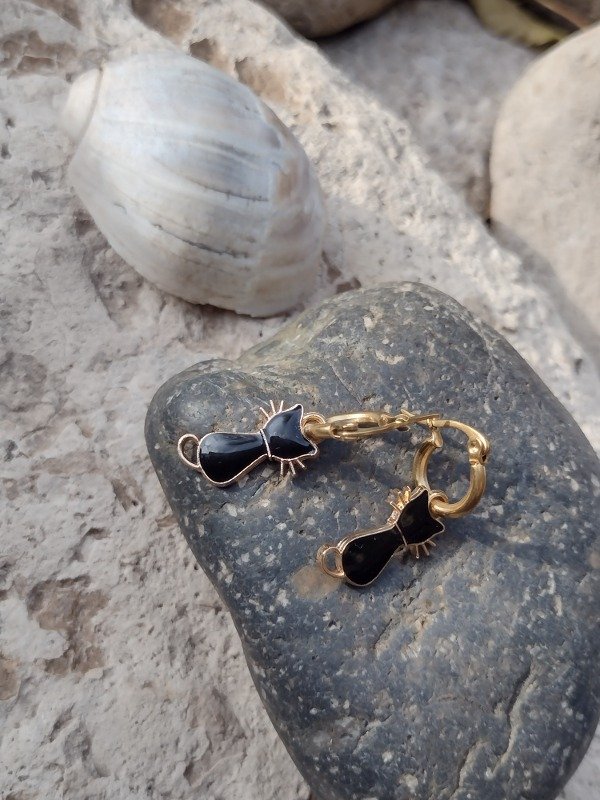 Aros argolla dorado 5 mm combinados con dije de gatito negro en metal esmaltado