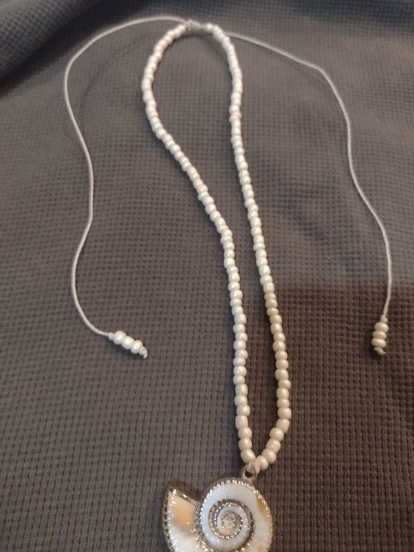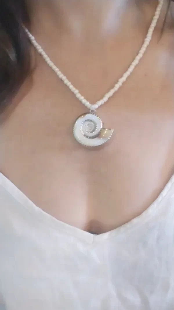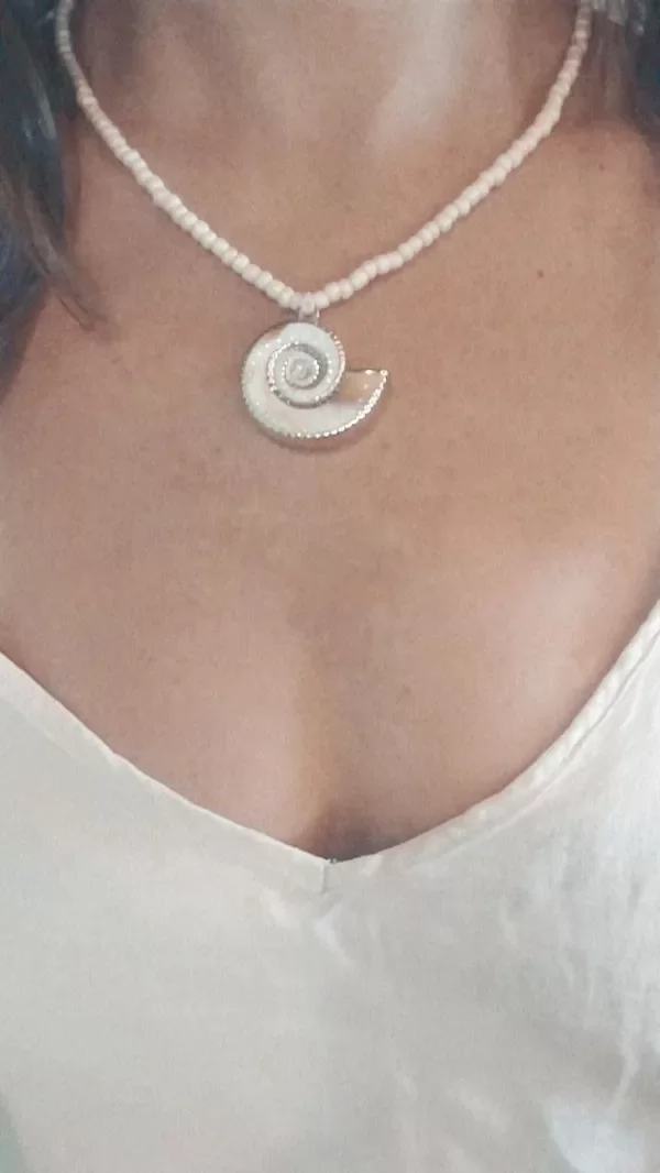 Collar Buzio de resina combinado con mostacillones color champagne enhebrados en línea encerada, altura regulable, se regula desde el nudo corredizo