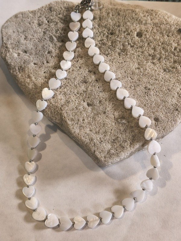 Collar de corazónes de nacar 8 mm combinados con mostacillas checas plateadas cierre con mosqueton y argollas varias posiciones en acero quirúrgico