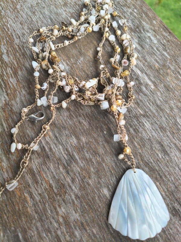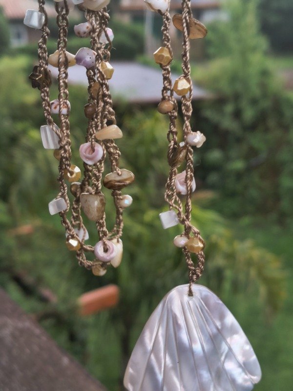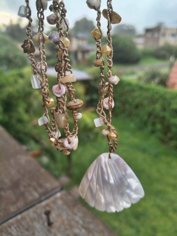 Collar confeccionado artesanalmente en crochet combinado con una pieza d enacar cuentas de naca mostacillas cristalitos tienen un mosqueton para cerrarlo a la altura que quieras