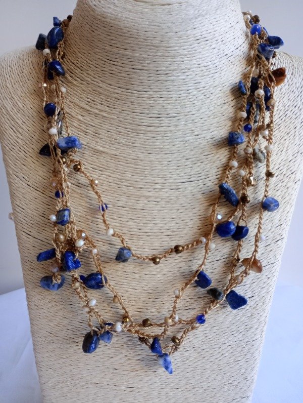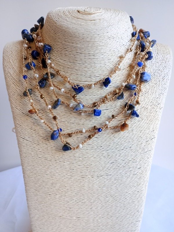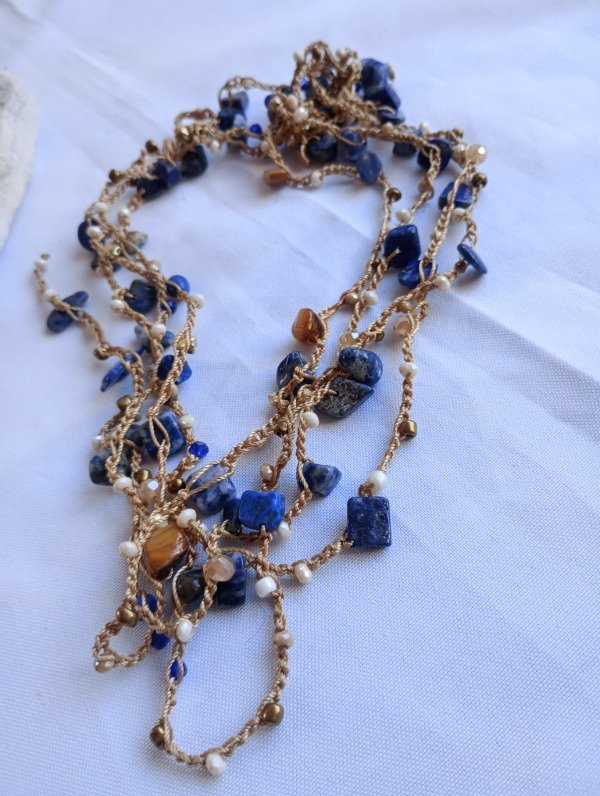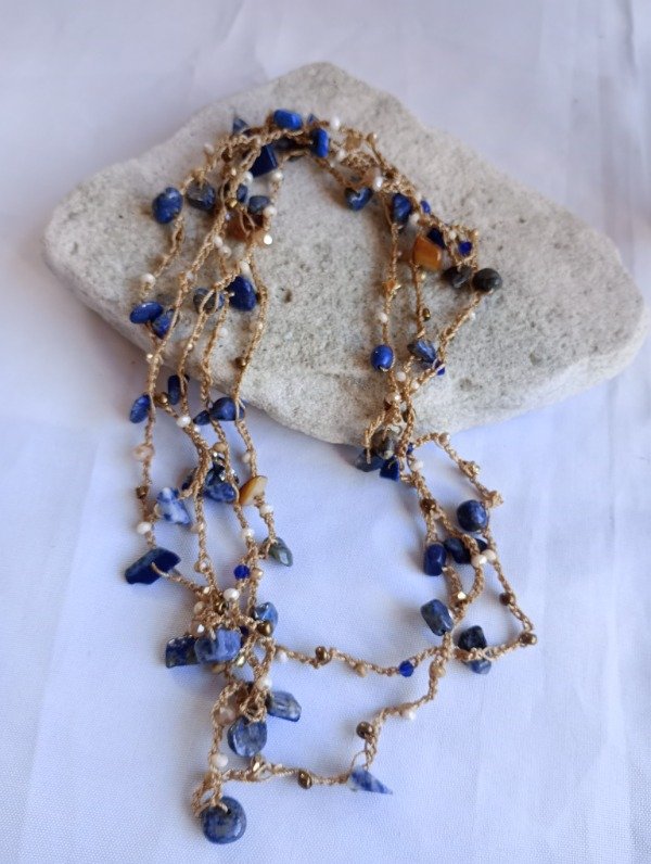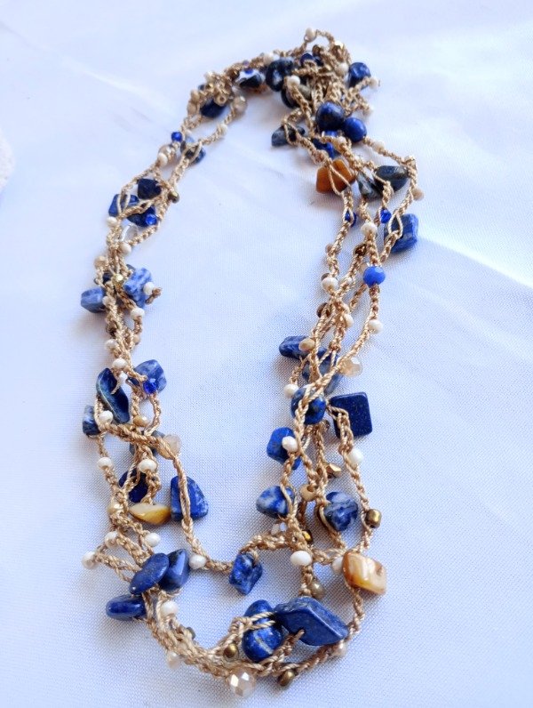 Confección artesanal tejido en crochet con hilo de poliéster contiene piedras escallones naturales de lapislázuli y sodalitas.nacst cristal de roca acrílico y un mosqueton de metal para cerrar el collar a la altura deseada