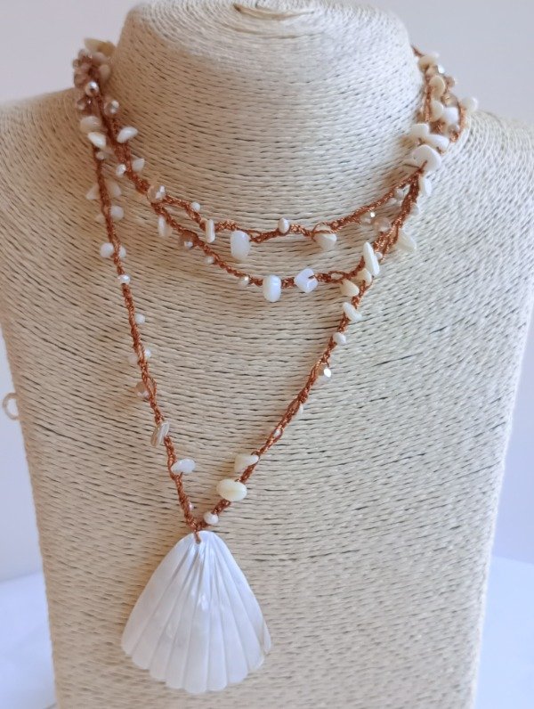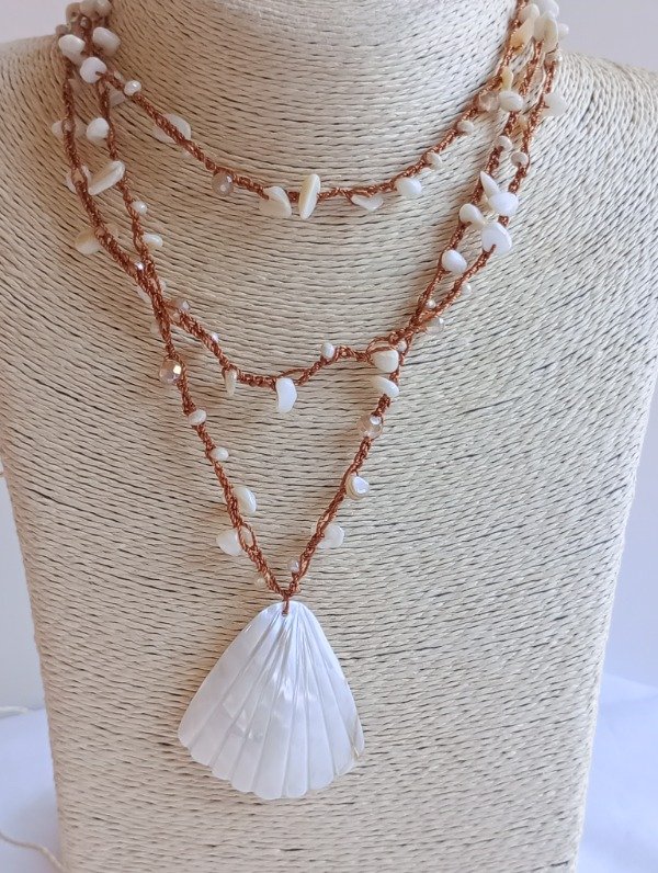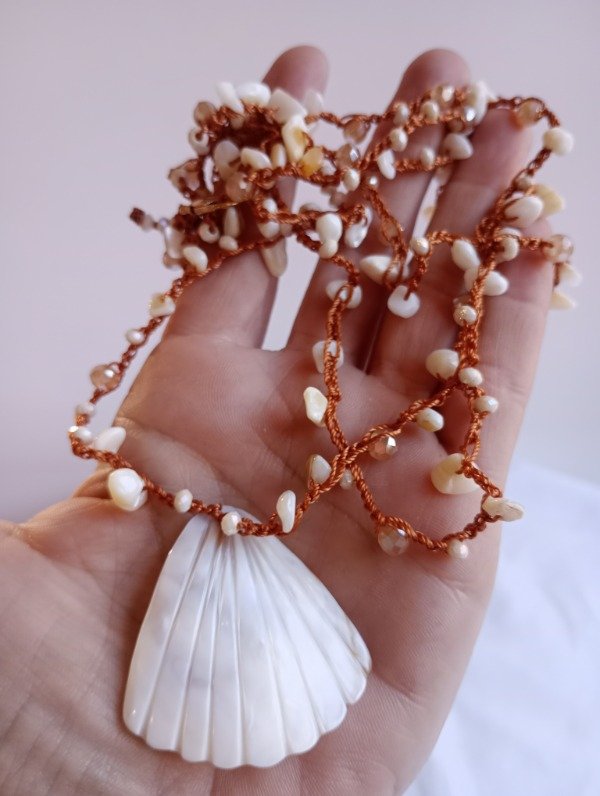 Confección artesanal tejido en crochet con hilo en poliéster cuentas de naca, cristal roca y acrílico dije de Nácar central.