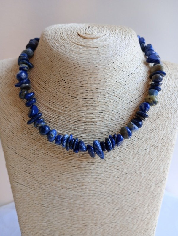 Collar piedras naturales Lapislázuli irregulares enhebrada en tanza acerada cierre con mosqueton y argollas varias posiciones en acero