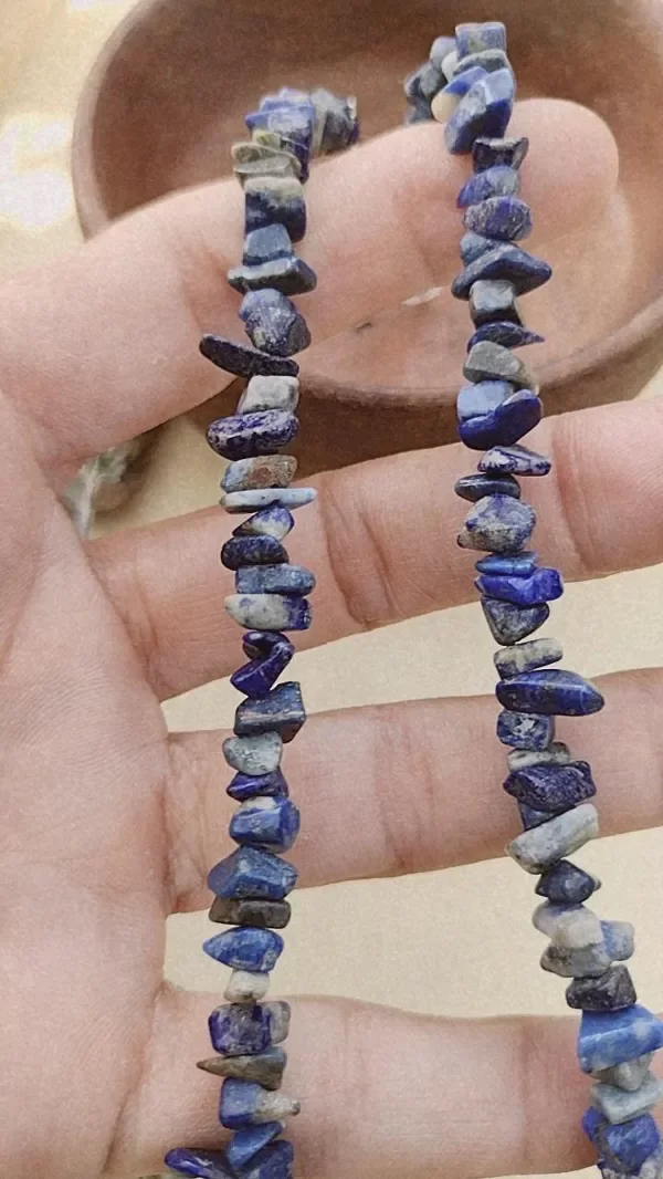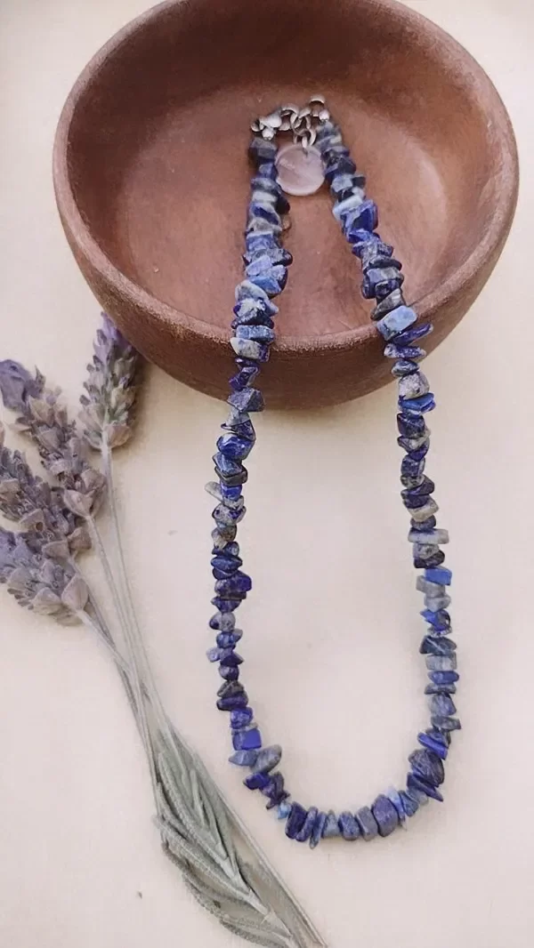 Collar piedra escalla Lapislazuli enebrada en tanza acerada cierre con mosqueton y argollas varías posiciones de acero