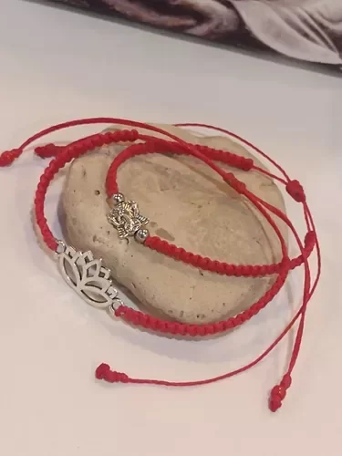 Pulsera dije metal flor de loto con hilo rojo encerado también confección artesanal en macramé con nudo corredizo.